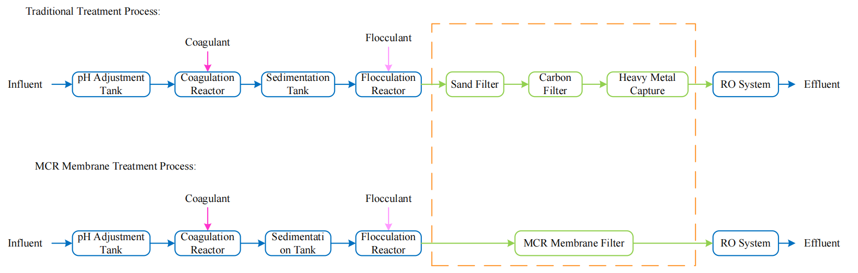 As the core of the MCR membrane process, JMFILTEC silicon carbide ceramic membrane can directly replace these steps, integrating multiple processing functions in one step, greatly simplifying the processing steps and reducing the footprint; the MCR membrane efficiently intercepts and concentrates heavy metal flocs, making the heavy metal recovery effect better, and achieving the treatment goal of "simple steps, low footprint, and good recovery".