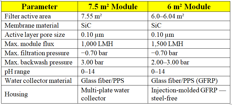 Both module sizes share the core SiC advantages that make them superior to polymeric and conventional ceramic oxide membranes: permanent hydrophilicity, absolute pathogen rejection, full pH tolerance, long service life, and resistance to aggressive cleaning. The choice between them is primarily one of design priority: